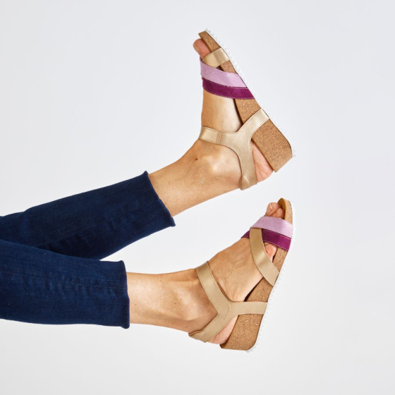 Caractérisée par une semelle en liège compensée et des lanières en cuir de qualité dans des tonalités parme et violet, Carly apportera élégance et féminité à votre garde-robe.